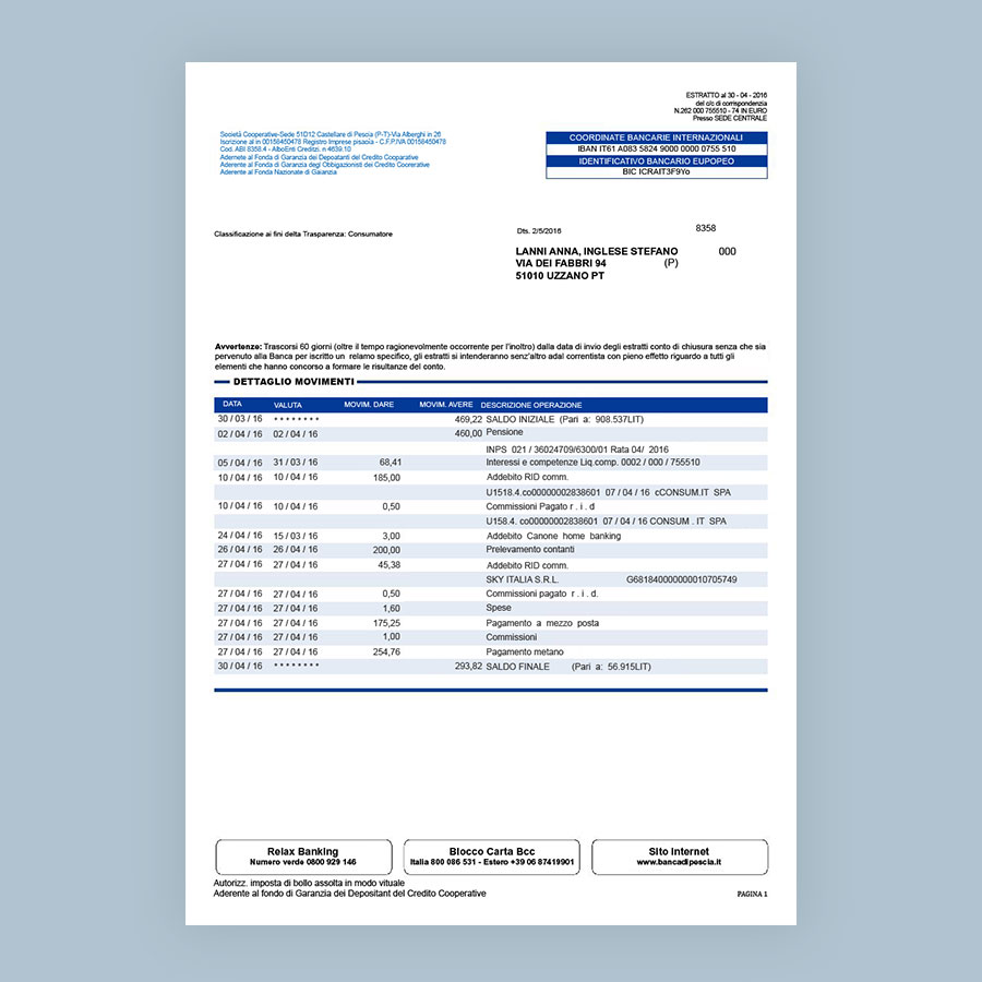 Like all our documents, the Banca Di Pescia Bank Statement is both high quality and up to date. With our custom service, you can add the details you wish to appear on your fake Banca Di Pescia Bank Statement. From custom transactions, to name, address, bank, branch and even starting and ending balances. You can purchase 1 statement or multiples from 3 months to 6, 12 months statements depending on your requirements. We provide you with a high quality printable PDF file, the same as usually comes direct from your online banking. For most people this is enough as they can print it themselves for those of you that need a copy by post this also available on request shipping times you can view our shipping information page.