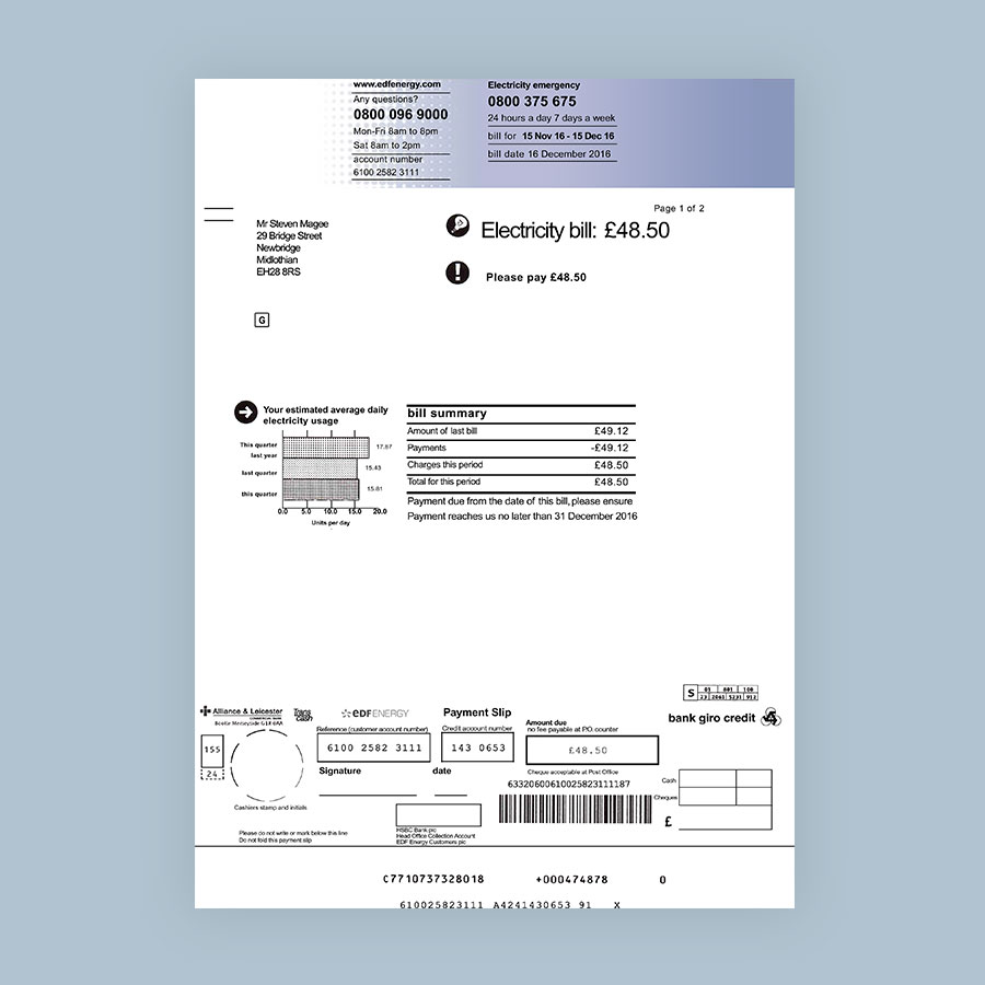 Our team are on hand to process your order as quickly as possible. All orders are guaranteed within 3-4 business days, but can usually be done a lot quicker. If you need your fake EDF (UK) Utility Bill quickly, we have an express service available which will bring that turnaround down to just 24-48 hours.