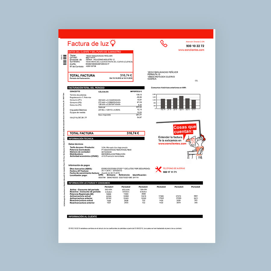 Our team are on hand to process your order as quickly as possible. All orders are guaranteed within 3-4 business days, but can usually be done a lot quicker. If you need your fake Eon (Spain) Utility Bill quickly, we have an express service available which will bring that turnaround down to just 24-48 hours.